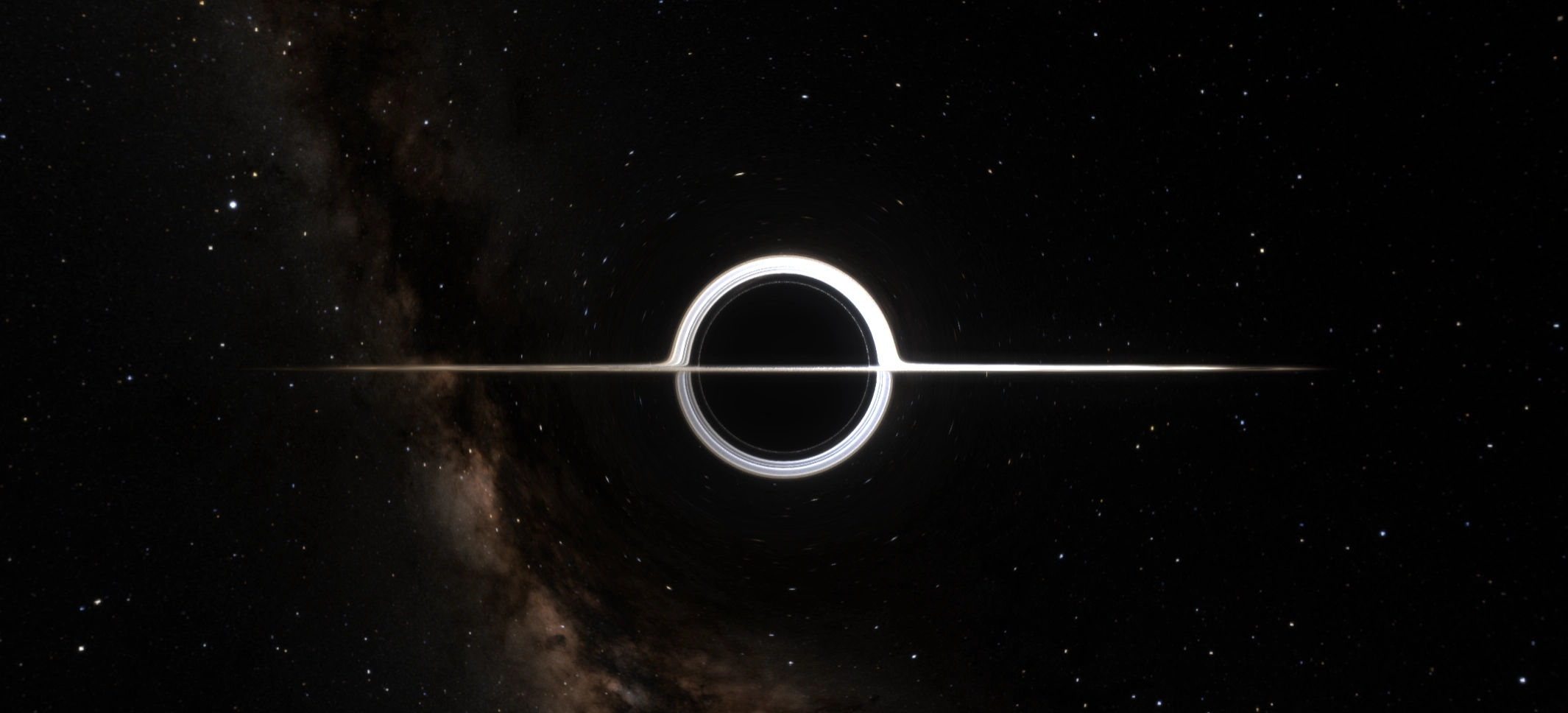 Schwarzschild geodesic ray-marching simulates how light bends around the event horizon in real-time.